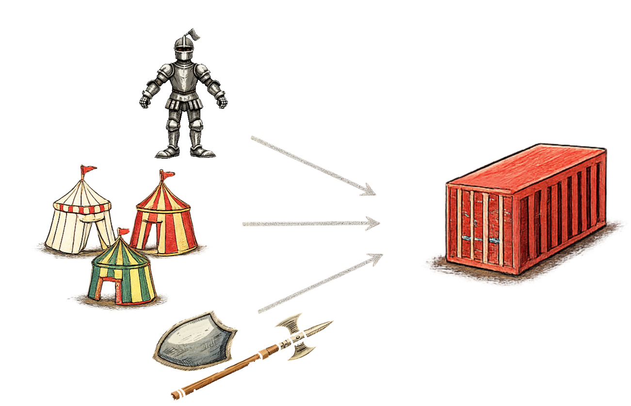 Why fly your heavy armor and tents home every year? Our year-long storage solution is located directly on the Bicolline site.